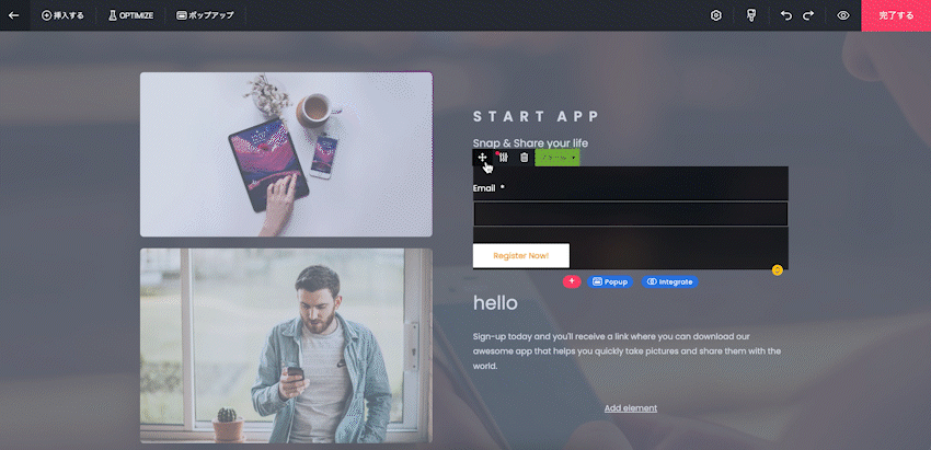 ドラッグ&ドロップで直感的にランディングページが作成できます。