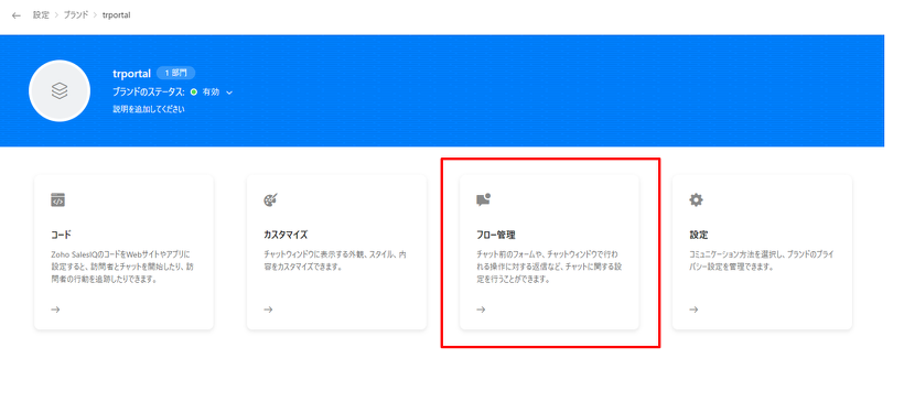 Zoho SalesIQのブランド設定にて、チャットウィジェットのフローを設定管理することができます。