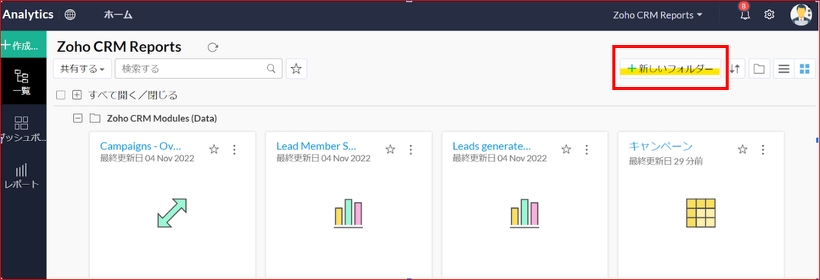 手順1:Zoho Analyticsの、画面右上の「新しいフォルダー」を押す