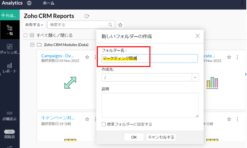 ※フォルダー名は、一目で何についてのグラフやレポートか分かるものを設定しましょう。