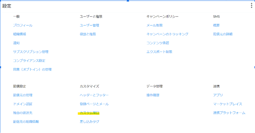 手順1:設定画面より、カスタム項目を選択