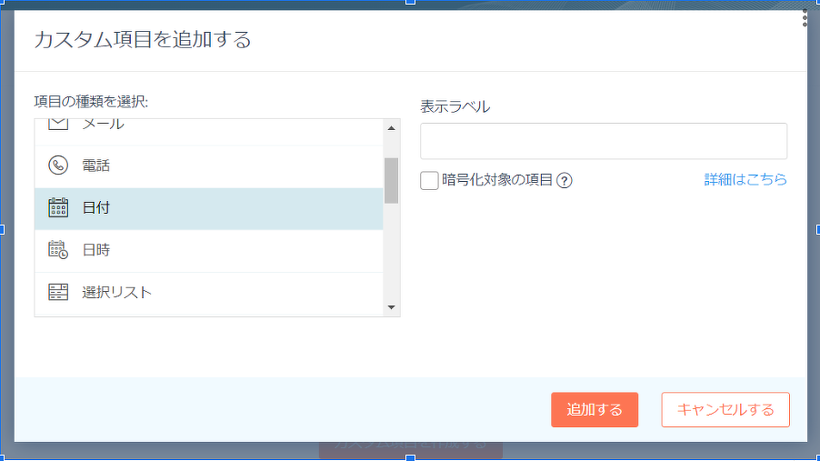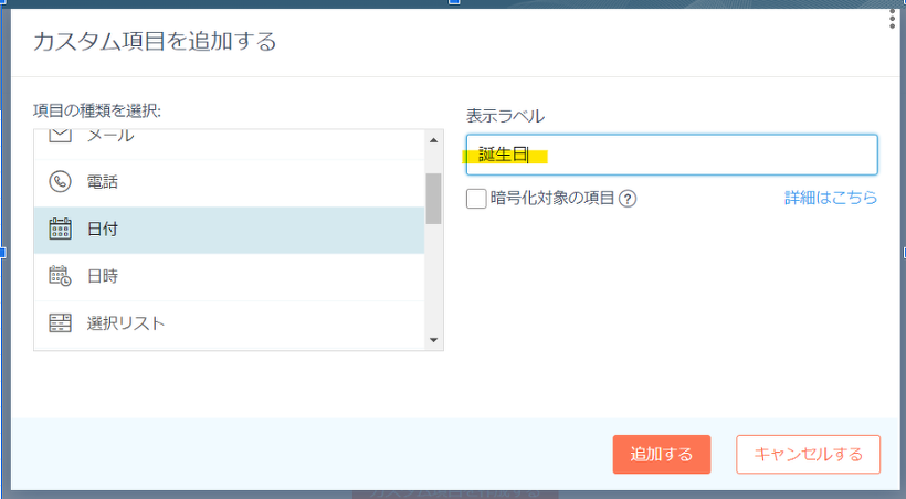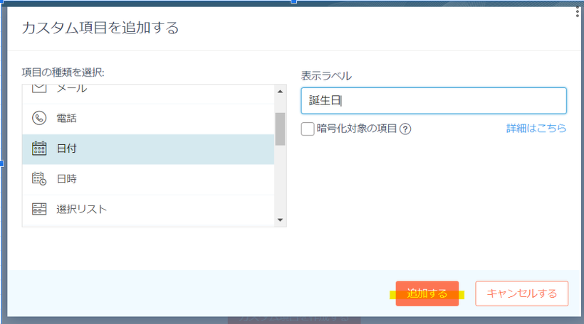 ※例として誕生日項目を作成するため、今回は「日付」を選びます