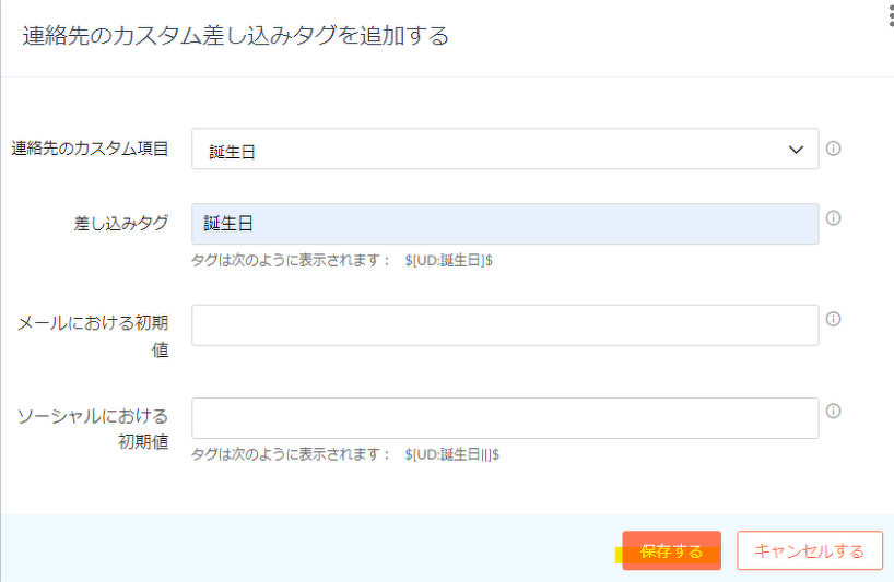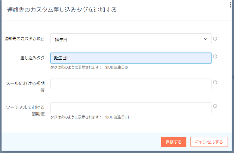 ※例として誕生日の差し込みタグを作成するため、今回は「誕生日」と入力します
