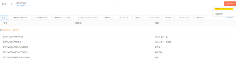 手順2:画面右上の「作成する」プルダウンより「連絡先のカスタムタグ」を選択