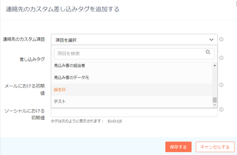 ※例として誕生日の差し込みタグを作成するため、今回は「誕生日」を選びます
