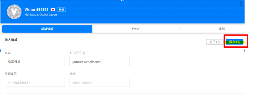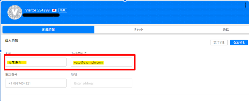 手動で訪問者情報(名前やメールアドレス)をZoho SalesIQに入力することで、