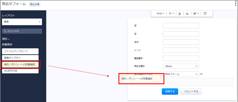 それでは早速、下記手順に沿ってWebフォームに利用規約やポリシーの項目を追加させましょう!