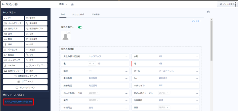 手順4:カスタム項目の上限が表示されるので、上限数を確認