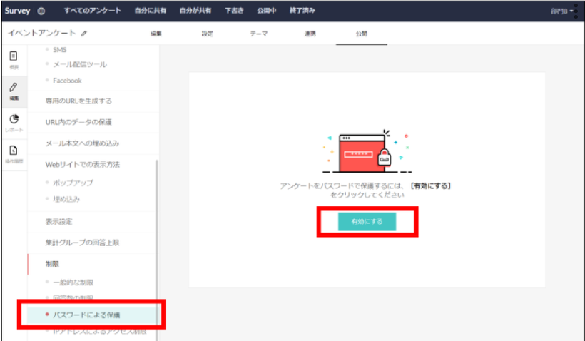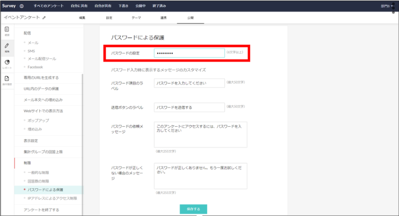 パスワードを知っている人のみアンケートにアクセスできるように設定することができます。