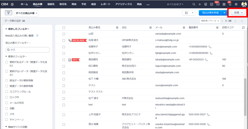 【手順1】見込み客タブの一覧画面右上の「処理」を押す