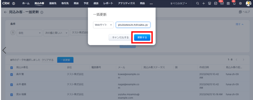 例えば、同一企業所属の見込み客10件に対し、会社のWebサイトのURLを入力したい場合、