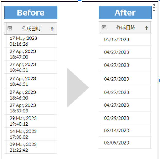 日時項目の形式を変更できないため、日付に加え、秒数まで表示されて、見にくい...