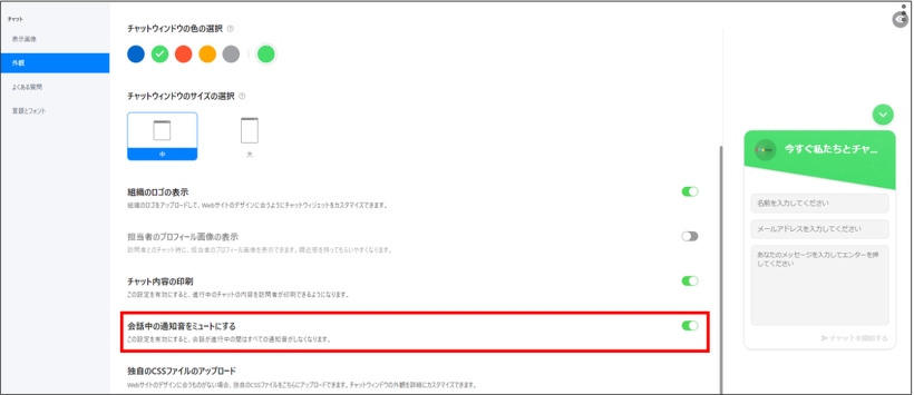 こちらをオンにすることで、訪問者がチャットボットとのチャット中のサウンドを手動でオン/オフにすることができるようになります。