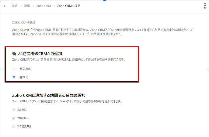 また、Zoho SalesIQの連絡先の情報がZoho CRMのどのタブに追加されるかは、連携設定に依存します。