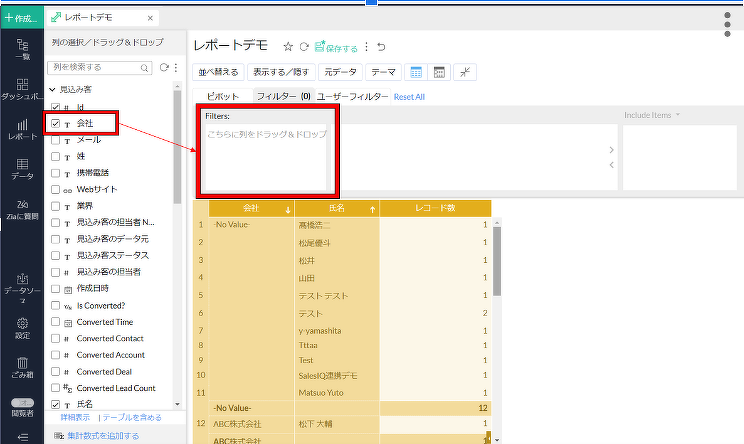 【手順3】列の一覧より、‐No Value‐となっている列をフィルターに追加
