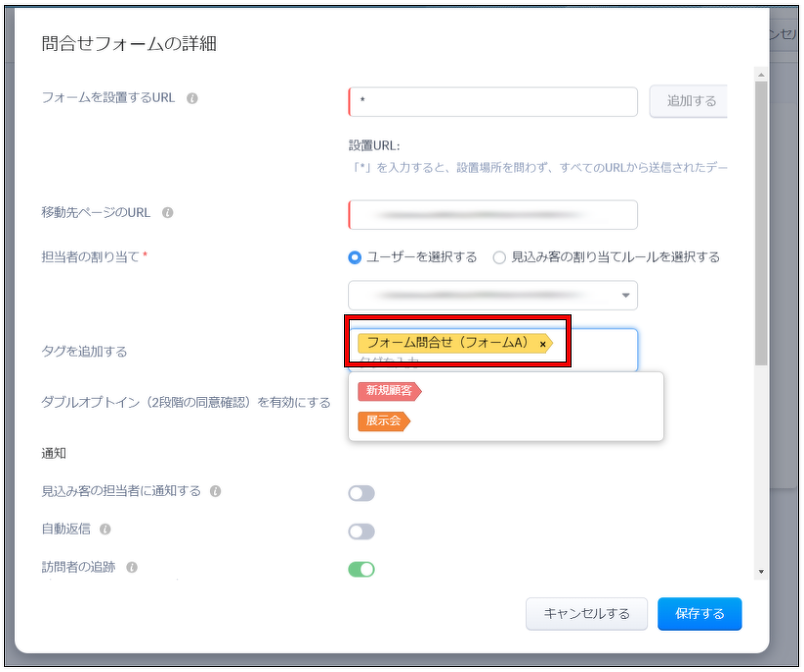 そうすることにより、該当フォーム経由で作成された見込み客にタグが自動で付与されるので、