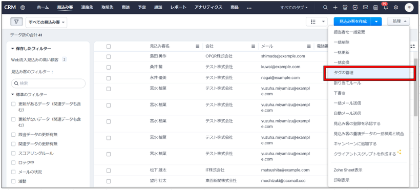 【手順1】見込み客タブの「処理」を押し、「タグの管理」を選択